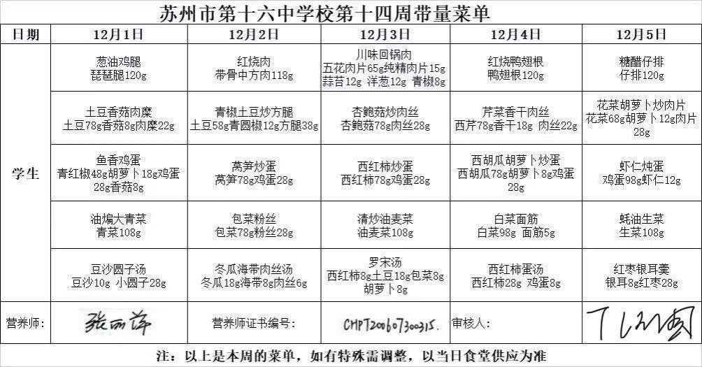 苏州市第十六中学校2025—2026学年第一学期第14周菜单