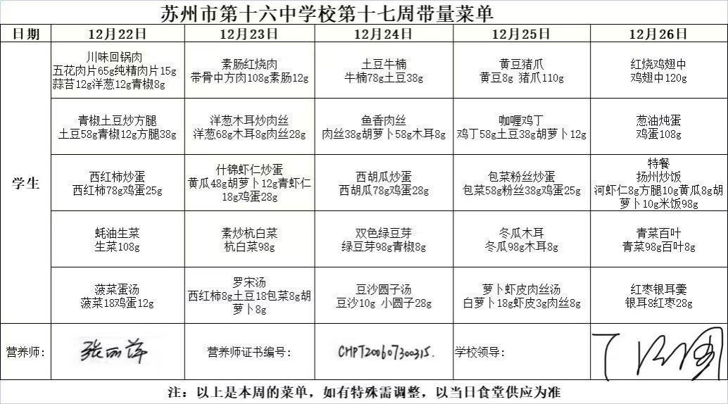 苏州市第十六中学校2025—2026学年第一学期第17周菜单