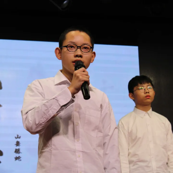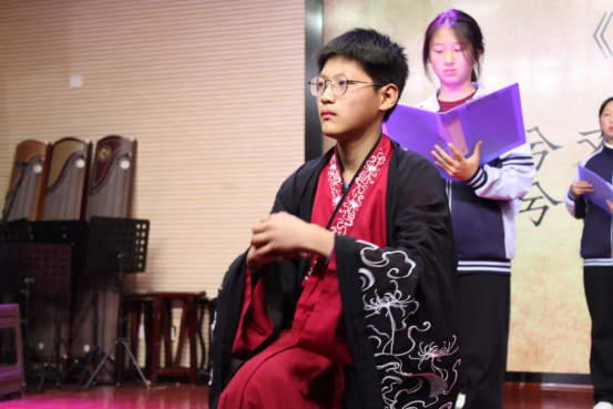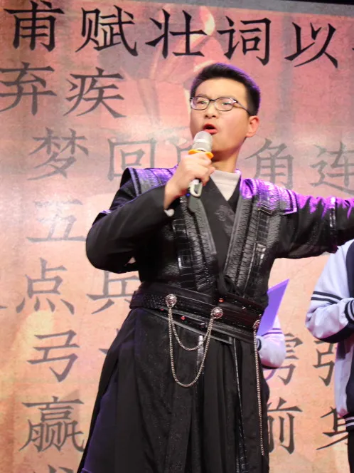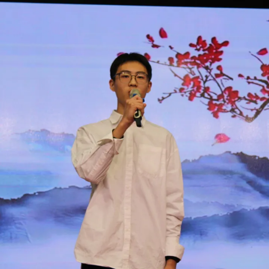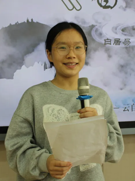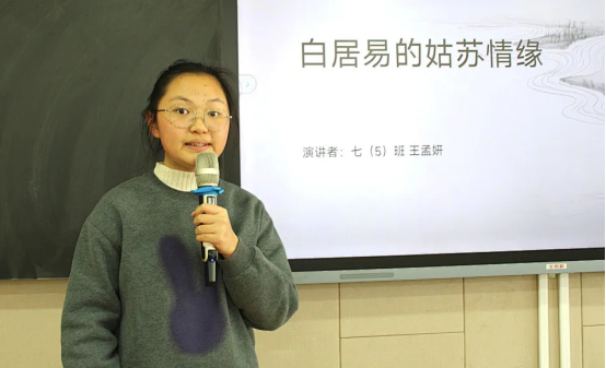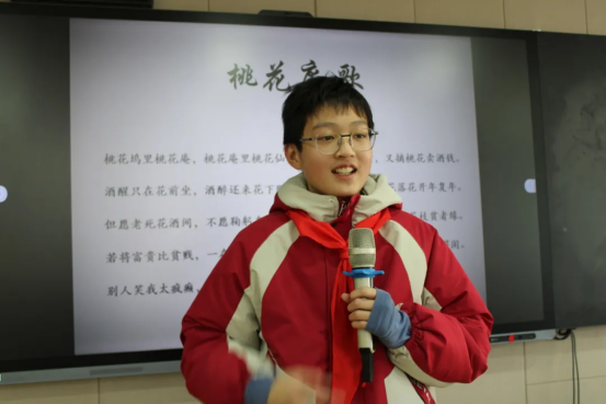 伴着婉转悠扬的音乐,一首《枫桥夜泊》被轻轻唤醒,将千年的钟声带回校园;也有同学站立台前,将白居易“忧国忧民”的故事娓娓道来,言语间铺展开一代文人的山河襟怀。从李白到唐寅,从《白云泉》到《桃花庵歌》,少年之声,承古启今,赢得阵阵赞叹。