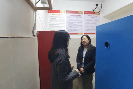 随后,在办公室朱宏主任陪同下,陶督学深入校园各安全关键点位,对照近20项安全要求逐一核查。在传达室,查看安保人员信息与监控记录,询问学生外出管理流程,检查安保“八小件”配备情况;在电动车充电区,重点查看消防新“三件套”(消防长钩、锂电池专用灭火器、智能AI摄像头)配置与使用,强调充电管理规范;在教师办公室、停车场、消控室、化学实验室等处,督学细致检查电器使用、车辆停放、消防控制、危化品管理等,不放过任何安全细节。