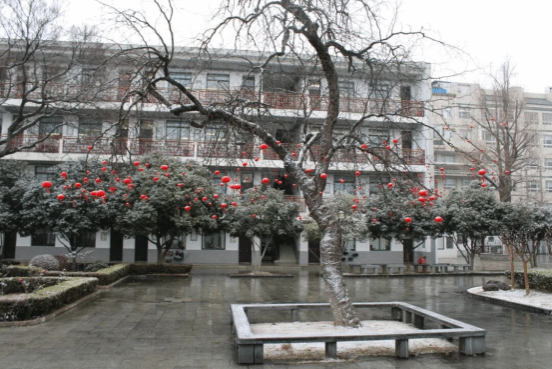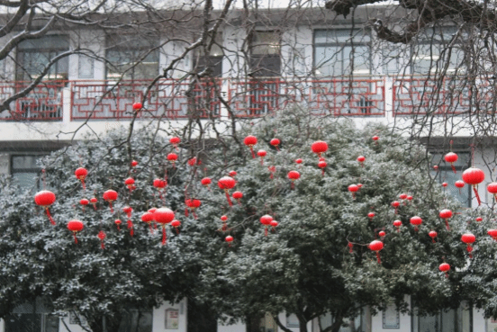 移步至教学楼前,时光仿佛在这儿停驻。那株历经百年的老枣树上栖满晶莹的雪絮,枝头一盏盏迎接新年的小红灯笼,恰似点点朱砂,在冷白的世界里晕染出暖意融融的喜庆。最引人注目的,是枝丫间悬着的一只斑驳古朴的铜钟。曾经,清脆的钟声唤醒过多少晨读的少年;而今,它化作岁月的凝视,看雪落无声,听新岁已至,使英华园的旧梦与新愿在雪色里交相辉映。