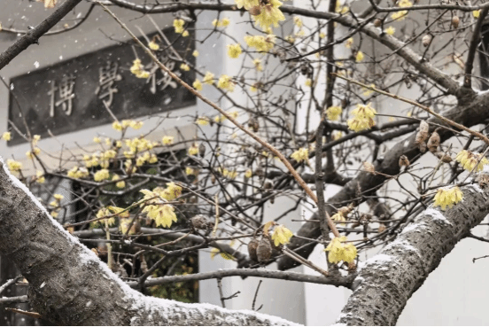 同学们坐在教室里,忽觉天光微变,抬眼处,竟是漫天琼芳纷坠。“白雪却嫌春色晚,故穿庭树作飞花。”须臾之间,英华园褪去了往日的斑斓,披上了一袭圣洁的白纱。