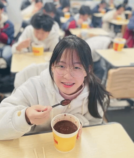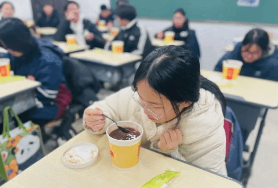 黄昏时分,有的学生欣喜地品尝到班主任老师精心准备的腊八粥,集体的融融暖意流淌在寒冷的时节里。