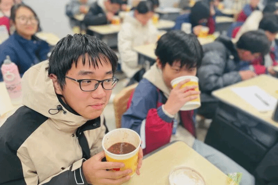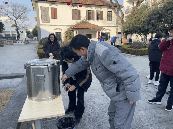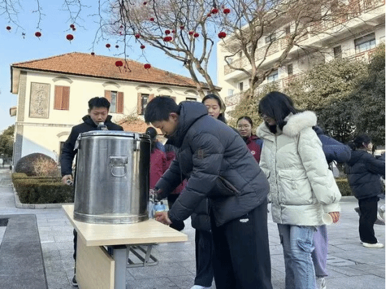 上午8:40—10:00、下午1:40—3:00,振声楼前、枣树下,学校后勤部门持续为师生提供保温姜茶,琥珀色的姜茶清香微甜,课间同学们品尝、分享着这份来自学校的温暖,如同冬日里的暖阳照亮了师生心里。