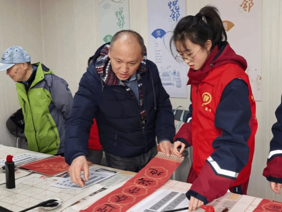 活动现场暖意融融,墨香与欢笑交织成最动人的冬日图景。在春联书写区,学生志愿者们铺展红纸、研磨挥毫,笔走龙蛇间,一副副寓意吉祥的春联跃然纸上,字里行间,尽是迎祥纳福的美好祝愿。