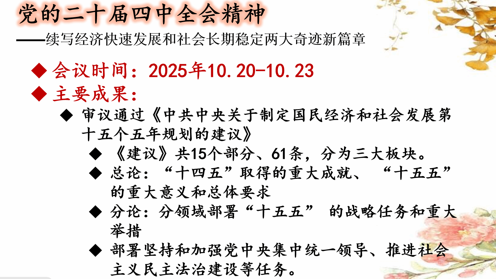 学习会上,徐然校长以“续写经济快速发展和社会长期稳定两大奇迹新篇章”为切入点,系统解读了二十届四中全会的主要成果,重点阐述了审议通过的《中共中央关于制定国民经济和社会发展第十五个五年规划的建议》的框架内容与重大意义。校长指出,“十五五”时期是我国发展的关键阶段,必须深刻领会全会精神,既要乘势而上,也要迎难而上。徐校长强调,要准确把握全会部署的战略任务和重大举措,紧密结合学校实际,坚持党的全面领导,以推动高质量发展为主题,将服务国家战略与提升办学治校水平相结合。要聚焦立德树人根本任务,着力培养担当民族复兴大任的时代新人,为推动“十五五”时期各项目标任务的实现,特别是高质量发展、科技自立自强、人民生活品质提升等方面贡献教育力量。