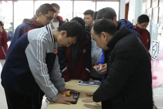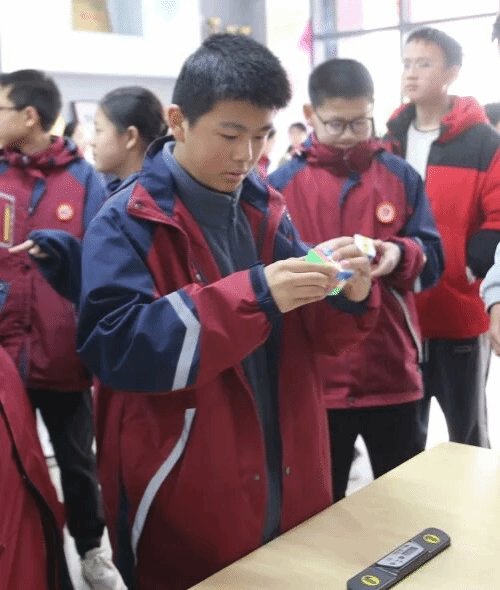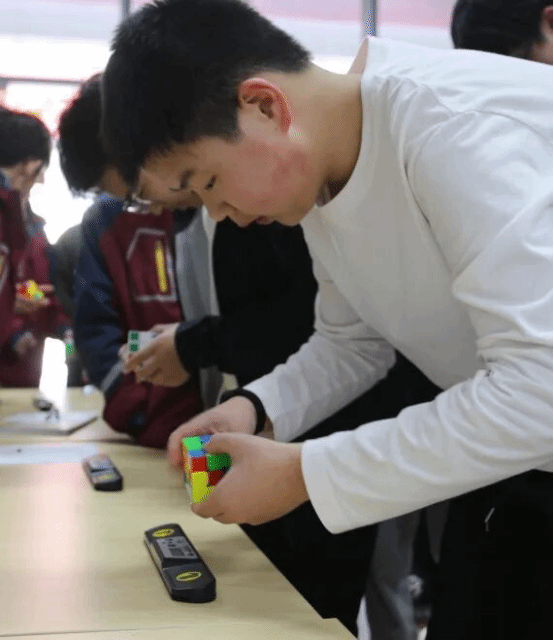 备受瞩目的 “魔方速拧”挑战赛率先点燃战火。比赛现场,指尖的飞舞成为最亮丽的风景线,选手们需以最快速度将打乱的魔方六面还原,这不仅是对手速的考验,更是对空间想象力和记忆力的一次极致挑战。十六学子在魔方项目上素有不俗表现,本次活动中冠军在1分钟内完成三阶魔方还原,展现了强大的心理素质与观察能力。